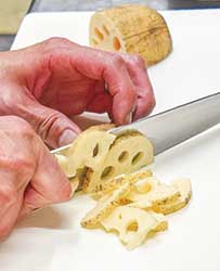 レンコンとゴボウの皮は付いたままでもOK!火の通りが均一になるように厚さをそろえる。