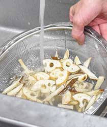 レンコンとゴボウを水で洗う。レンコンを5mm幅にスライス、ゴボウを千切りにする。