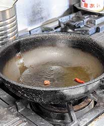 フライパンに油と鷹の爪を入れ、香りが立つまで加熱する。レンコン、ゴボウ、塩コショウを入れ、炒める。