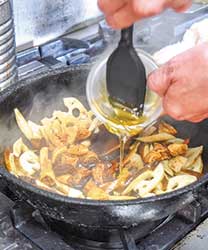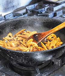 レンコンとゴボウがしんなりしてきたら、ドライイチジク、バルサミコ酢、ハチミツを入れ、炒める。