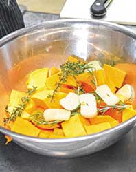 ニンニクをスライスする。ボウルにカボチャ、ニンニク、ローズマリー、塩、油を入れ、さっと混ぜ合わせる。 ローズマリーの代わりにタイムなどのハーブを使っても。