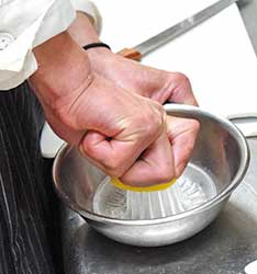 レモンを2枚スライスし、残りは搾り器などを使って搾る。