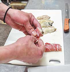 生ハムが大きい場合は半分にカットする。カキは生食用と加熱用どちらでもよいですが、加熱用を使う場合は、④の工程でしっかり火を通しましょう。