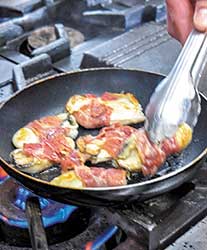 生ハムの切れ端がある側から焼くと、小麦粉が接着剤代わりになり、形が崩れにくくなります。
